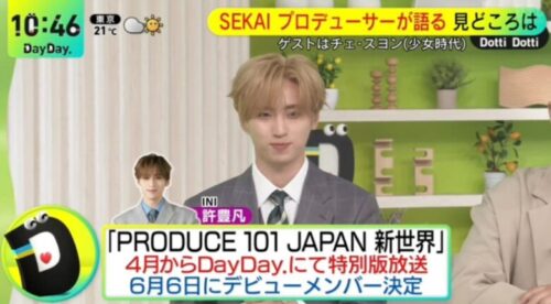 しかし、早速3月30日(月)のDayDay.新年度初回放送で許豊凡さんが登場し、SEKAIプロデューサー代表の少女時代チェ・スヨンさんをゲストに迎え、日プ新世界について放送されました。