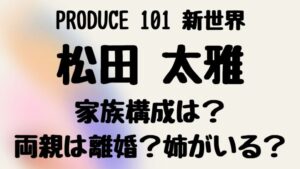 松田太雅の家族構成!両親は離婚?姉がいる? 2026年春放送予定の大人気オーディション番組「PRODUCE 101 JAPAN 新世界(日プ4)」の出演が発表された松田太雅(まつだたいが)さん。 今回は、松田太雅さんの家族構...