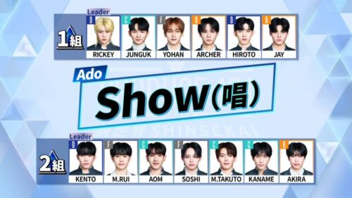 1組 :安部 結蘭(リーダー)、加藤 大樹 、ユン・ジェヨン、パク・シヨン 、小笠原 ジュゼッペ 慧、矢田 佳輝